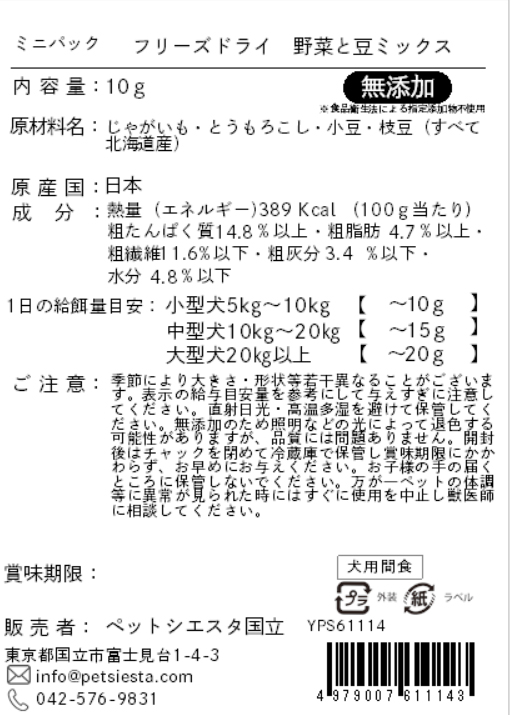 | 注意事項 | 季節により大きさ・形状等若干異なることがございます。表示の給与目安量を参考にして与えすぎに注意してください。直射日光・高温多湿を避けて保管してください。無添加のため照明などの光によって退色する可能性がありますが、品質には問題ありません。開封後はチャックを閉めて冷蔵庫で保管し賞味期限にかかわらず、お早めにお与えください。お子様の手の届くところに保管しないでください。万が一ペットの体調等に異常が見られた時にはすぐに使用を中止し獣医師に相談してください。 |