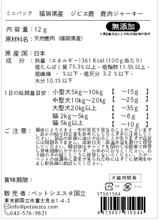 | 注意事項 | 個体により大きさ・形状等若干異なることがございます。表示の給与目安量を参考にして与えすぎに注意してください。製品の表面に油分が出ることがありますが品質には問題ありません。直射日光・高温多湿を避けて保管してください。開封後はチャックを閉めて冷蔵庫で保管し賞味期限にかかわらず、お早めにお与えください。お子様の手の届くところに保管しないでください。万が一ペットの体調等に異常が見られた時にはすぐに使用を中止し獣医師に相談してください。 |