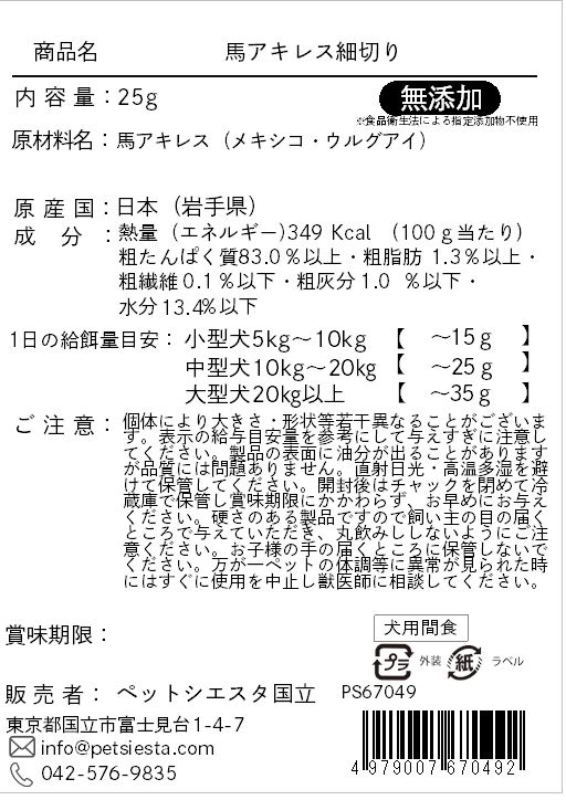 | 注意事項 | 個体により大きさ・形状等若干異なることがございます。表示の給与目安量を参考にして与えすぎに注意してください。製品の表面に油分が出ることがありますが品質には問題ありません。直射日光・高温多湿を避けて保管してください。開封後はチャックを閉めて冷蔵庫で保管し賞味期限にかかわらず、お早めにお与えください。硬さのある製品ですので飼い主の目の届くところで与えていただき、丸飲みししないようにご注意ください。お子様の手の届くところに保管しないでください。万が一ペットの体調等に異常が見られた時にはすぐに使用を中止し獣医師に相談してください。 |