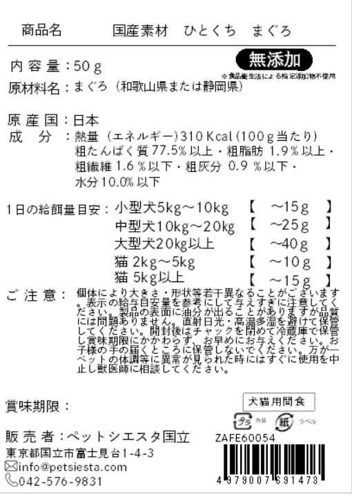 | 注意事項 | 個体により大きさ・形状等若干異なることがございます。表示の給与目安量を参考にして与えすぎに注意してください。製品の表面に油分が出ることがありますが品質には問題ありません。直射日光・高温多湿を避けて保管してください。開封後はチャックを閉めて冷蔵庫で保管し賞味期限にかかわらず、お早めにお与えください。お子様の手の届くところに保管しないでください。万が一ペットの体調等に異常が見られた時にはすぐに使用を中止し獣医師に相談してください。 |