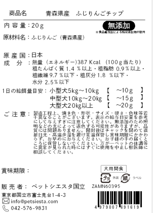 | 注意事項 | 季節により大きさ・形状等若干異なることがございます。表示の給与目安量を参考にして与えすぎに注意してください。直射日光・高温多湿を避けて保管してください。無添加のため照明などの光によって退色する可能性がありますが、品質には問題ありません。非常にしけりやすいため、開封後はすぐにチャックを閉めて冷蔵庫で保管し賞味期限にかかわらず、お早めにお与えください。お子様の手の届くところに保管しないでください。万が一ペットの体調等に異常が見られた時にはすぐに使用を中止し獣医師に相談してください。 |
