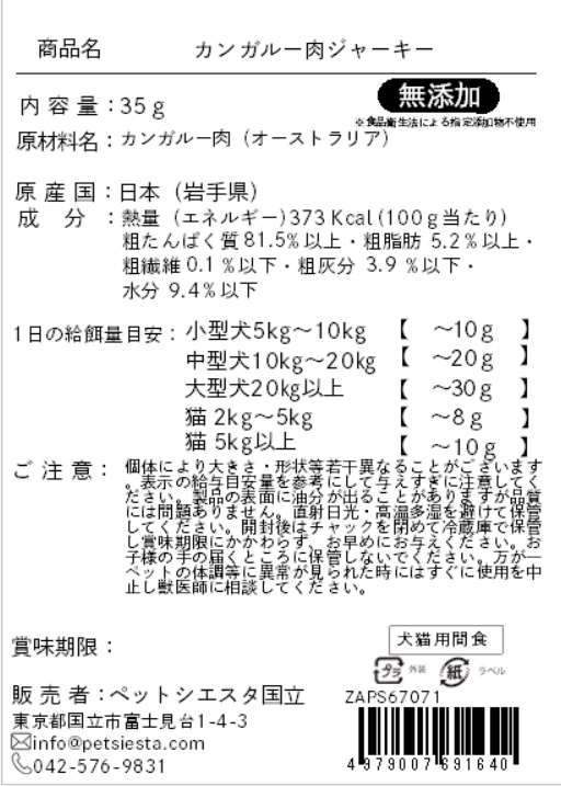 | 注意事項 | 個体により大きさ・形状等若干異なることがございます。表示の給与目安量を参考にして与えすぎに注意してください。製品の表面に油分が出ることがありますが品質には問題ありません。直射日光・高温多湿を避けて保管してください。開封後はチャックを閉めて冷蔵庫で保管し賞味期限にかかわらず、お早めにお与えください。お子様の手の届くところに保管しないでください。万が一ペットの体調等に異常が見られた時にはすぐに使用を中止し獣医師に相談してください。 |