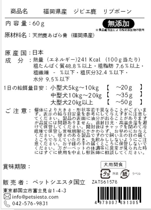 | 素材 | 天然鹿あばら骨(福岡県産) |
