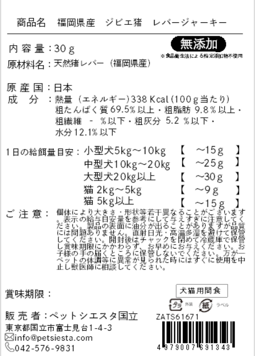 | 注意事項 | 個体により大きさ・形状等若干異なることがございます。表示の給与目安量を参考にして与えすぎに注意してください。製品の表面に油分が出ることがありますが品質には問題ありません。直射日光・高温多湿を避けて保管してください。開封後はチャックを閉めて冷蔵庫で保管し賞味期限にかかわらず、お早めにお与えください。お子様の手の届くところに保管しないでください。万が一ペットの体調等に異常が見られた時にはすぐに使用を中止し獣医師に相談してください。 |